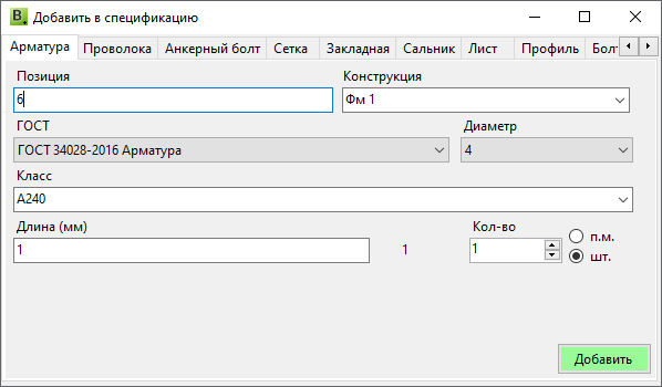 Окно добавления элемента